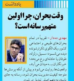 اقتصادسرآمد- مهدی دهدار- تقریباً در تمام بحرانهای طبیعی و اجتماعی کشور، یک الگوی تکرارشونده دیده میشود: سیل، زلزله، طوفان یا حادثهای رخ میدهد؛ خبرنگاران به میدان میآیند، واقعیتها روایت میشود و پیش از آنکه پرسشها متوجه کیفیت مدیریت بحران شود، رسانه به جای پاسخ، به متهم اصلی تبدیل میشود.