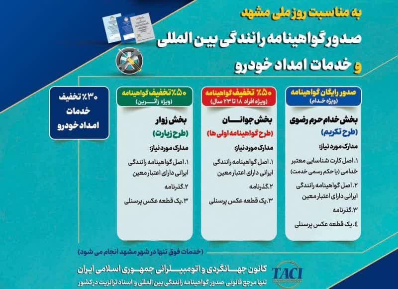 طرح تکریم خادمان و زائران رضوی با ارائه خدمات صدور گواهینامه رانندگی بینالمللی و امداد خودرویی