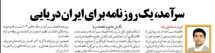 فیروز اسماعیلی نژاد- «اقتصاد سرآمد» از بدو پیدایش تا کنون، تمام سعی و اهتمام خود را برای دریا و توسعه ای دریایی ایران داشته است. «یک ایران دریایی» آرزوی مشترک تیم خبری و تحلیلی روزنامه بوده و هست و در این مسیر، هر چه توانستند کوشیدند تا رسالت رسانه ای خود را به خوبی انجام دهند.