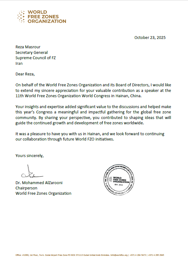 اقتصادسرآمد- در پی برگزاری یازدهمین کنگره جهانی سازمان جهانی مناطق آزاد در هاینان چین، دکتر محمد الزورانی، رئیس این سازمان، طی نامهای رسمی از مشارکت و سخنرانی رضا مسرور، دبیر شورای عالی مناطق آزاد تجاری ـ صنعتی و ویژه اقتصادی قدردانی کرد.