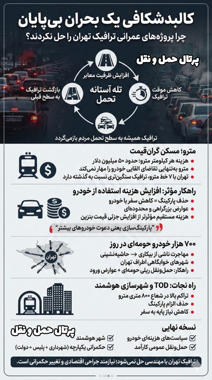 به گزارش اقتصادسرآمد، او با رد راهکارهای خطی و سادهانگارانه ، تأکید کرد که ترافیک حاصل تعامل پیچیده دهها حلقه علت و معلولی است و صرفاً با ساختن پل ، بزرگراه یا حتی مترو حل نخواهد شد .